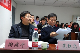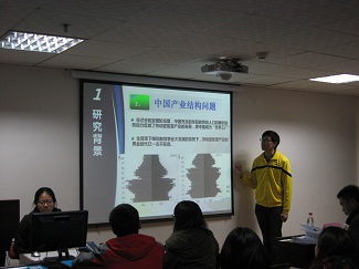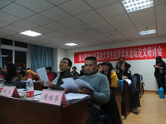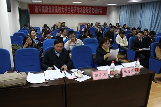 第三会场由公司魏龙教授和中国地质大学彭武元教授担任评委,选手们的选题通过对现有经济产业的理论实证分析,对未来中国经济发展的方向和前景进行展望。选手们的内容包括了生活的各个方面,有社会热点话题——房地产的发展,也有对经融危机的反思;既有学术性质浓郁的运用数学工具的选手,也有通过实证案例研究得出结论的“实践派”。两位教授认真的听了每组选手的论文答辩,细致入微的指出了每一篇论文的优点和可待改进的地方。就选手们论文中的一些亮点,提出了更深层次的问题,进行提问研究。选手们在回答这些问题的同时必然也认识到了自己论文研究更多的缺陷和精华。在和教授们的交流中收获了很多。