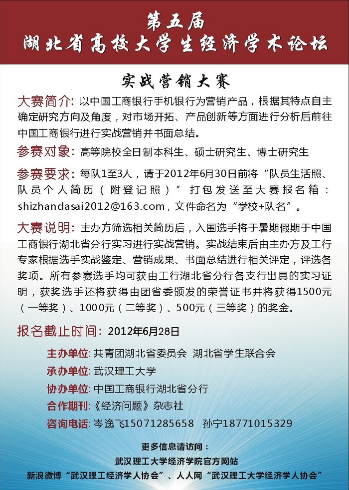 据本届经济论坛各项活动具体开展情况,兹定于2012年6月15日——9月31日进行经济论坛论文征集活动。全国各高等院校经济管理类相关本科生、硕士研究生、博士研究生及对经济管理类学科感兴趣的其他专业员工均可投稿参加。论文需保证原创性,具有较高学术价值,联系当前国际、国内热点问题,紧密贴合实际情况,探讨中国及世界经济发展方向,详情可关注新浪微博@武汉理工经济学人、人人网@武汉理工经济学人协会。欢迎广大师生参与!
