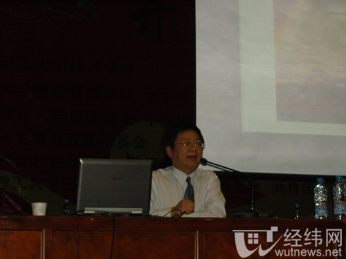 陶教授首先介绍了武汉城市圈的基本状况,他指出,在中部四大城市圈中,武汉城市圈的位置非常重要,但是整体经济实力不够强,目前与其他城市圈处于相互竞争协同的地位。随后他又重新定义了“两型社会”综合配套改革试验区的内涵,即节约资源,保护环境,并呼吁武汉要以建设生态城市圈为目标,完善市场经济体制,加快区域经济的调整,树立两型社会的典范。