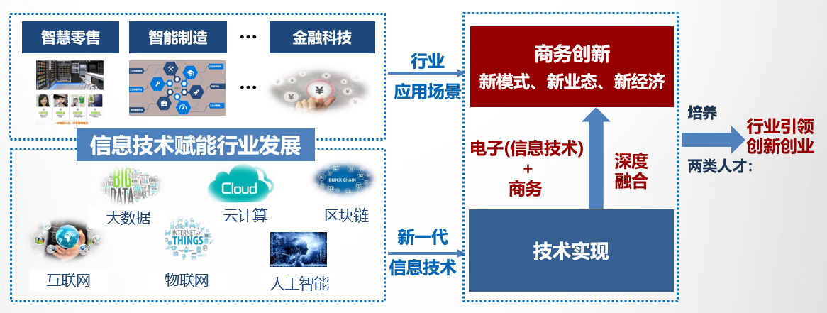 1) Insisting on the equal emphasis on technology and business, cultivating innovative and entrepreneurial talents.This specialty is a new business specialty formed by the intersection of science, engineering, economics, management, law and other disciplines, which integrates modern information technology such as Internet, cloud computing, big data, artificial intelligence, blockchain and business in depth, cultivates students' ability to support business innovation through technological realization, and assists in enterprise business model innovation, industrial structure transformation and upgrading, development of new economic forms in the society, and improvement of the efficiency of economic resource allocation.