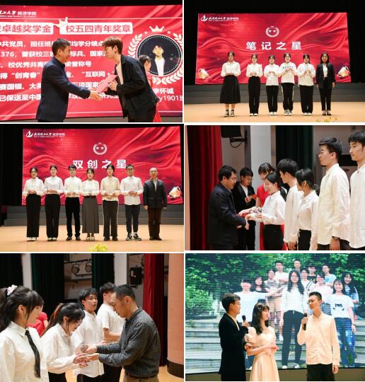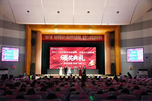 在一幕幕欢乐的暖场视频中,晚会正式开始。过去一年里,无数优秀经院学子争创佳绩,百舸争流。他们有强大的坚韧意志,有不歇的追梦脚步,他们凭着过人的才智和超群的意志,在成长之路书写着激情与梦想。晚会现场,校院领导和各系主任先后为“校卓越奖学金”“校五四青年奖章”“院三好员工标兵”“公司之星”获得者颁奖,获得“笔记之星”“双创之星”等经彩飞扬奖的57位同学依次上台接受表彰。其中,学术之星获得者李雪琴同学分享了自己从对于学术之路的憧憬、迷茫到收获的奋斗之路;笔记之星郭芯羽同学将自己在分类整理、重点突出的经验与心得进行了分享;实干之星闫平阳同学通过回顾自己从本科到研究生一直以来在校的员工干部成长经历,深刻感受到员工工作对于个人综合能力提升的特殊作用。晚会现场2022级本科生朗诵节目《青春的可能》,用文字展现青春,赞颂生命与奋斗的力量。