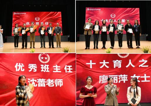 金科玉律真师范,化雨春风入我庐。沈蕾、杨爱民、徐晓明、胡国晖等7位老师分获“校院优秀班主任”。杨兰品、费日龙、胡国晖、黄艳希、吕娜等16位老师及员工获得“院十大育人奖”。其中,沈蕾老师及员工企业吧哒科技代表廖丽萍女士分别分享了自己在与同学们相处、相知、相守过程中的点滴故事和动人感受,现场为这背后的力量响起阵阵掌声。在舞蹈《走祥云》中,舞者翩翩起舞,舞出这盛世的华章,台下的观众惊叹连连,为这盛大而宏伟的舞蹈献上最高的赞赏。