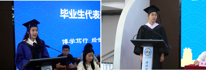 国贸系余珮老师、金融系沈蕾老师分别作为教师代表发言,向全体毕业生顺利完成学业致以祝贺,并在回顾与同学们相处的点滴时光中,寄语同学们铭记责任、保持学习、追求卓越,奋力彰显青年一代的活力与朝气。