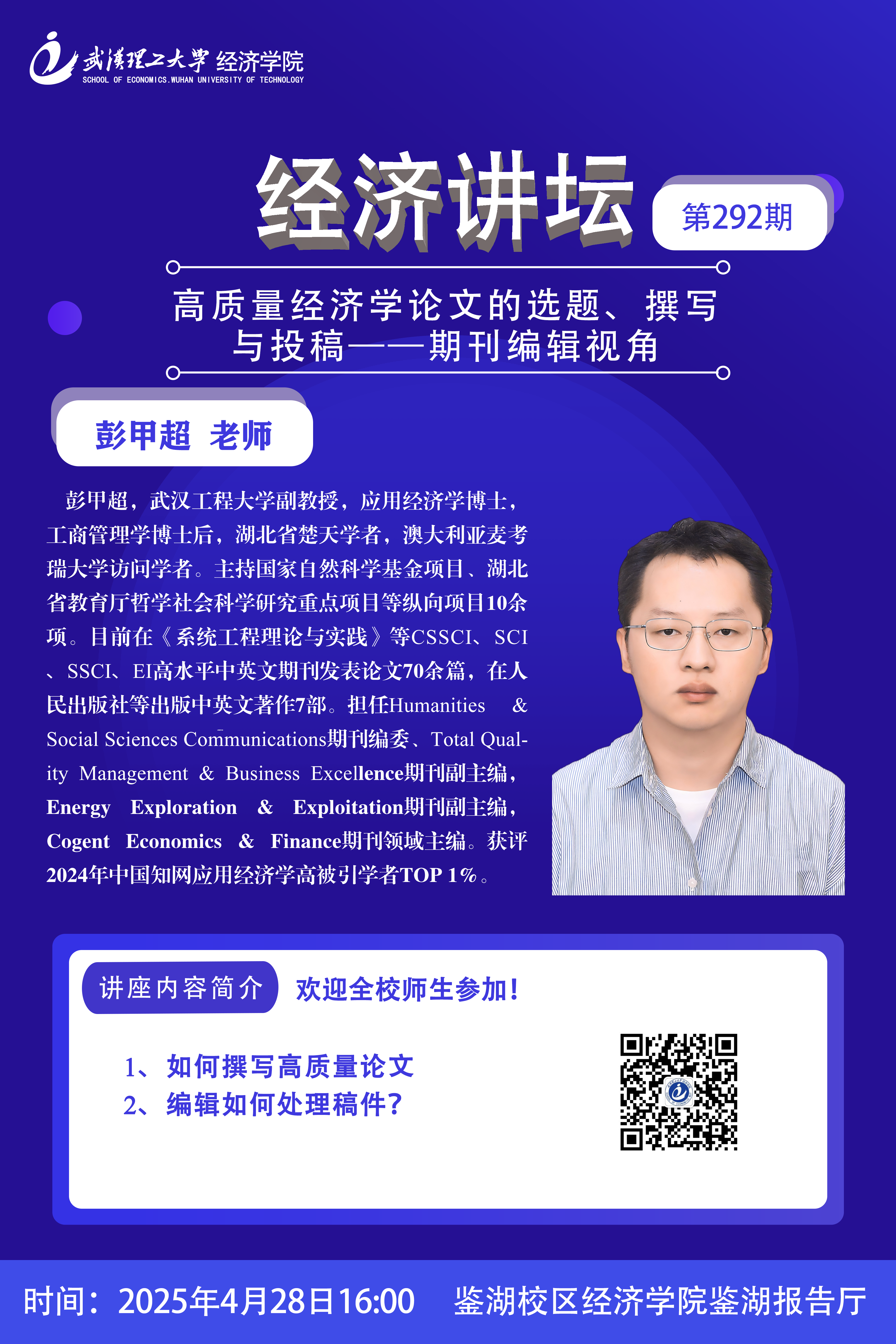 【经济讲坛】第292期 彭甲超老师:高质量经济学论文的选题、撰写与投稿--期刊编辑视角