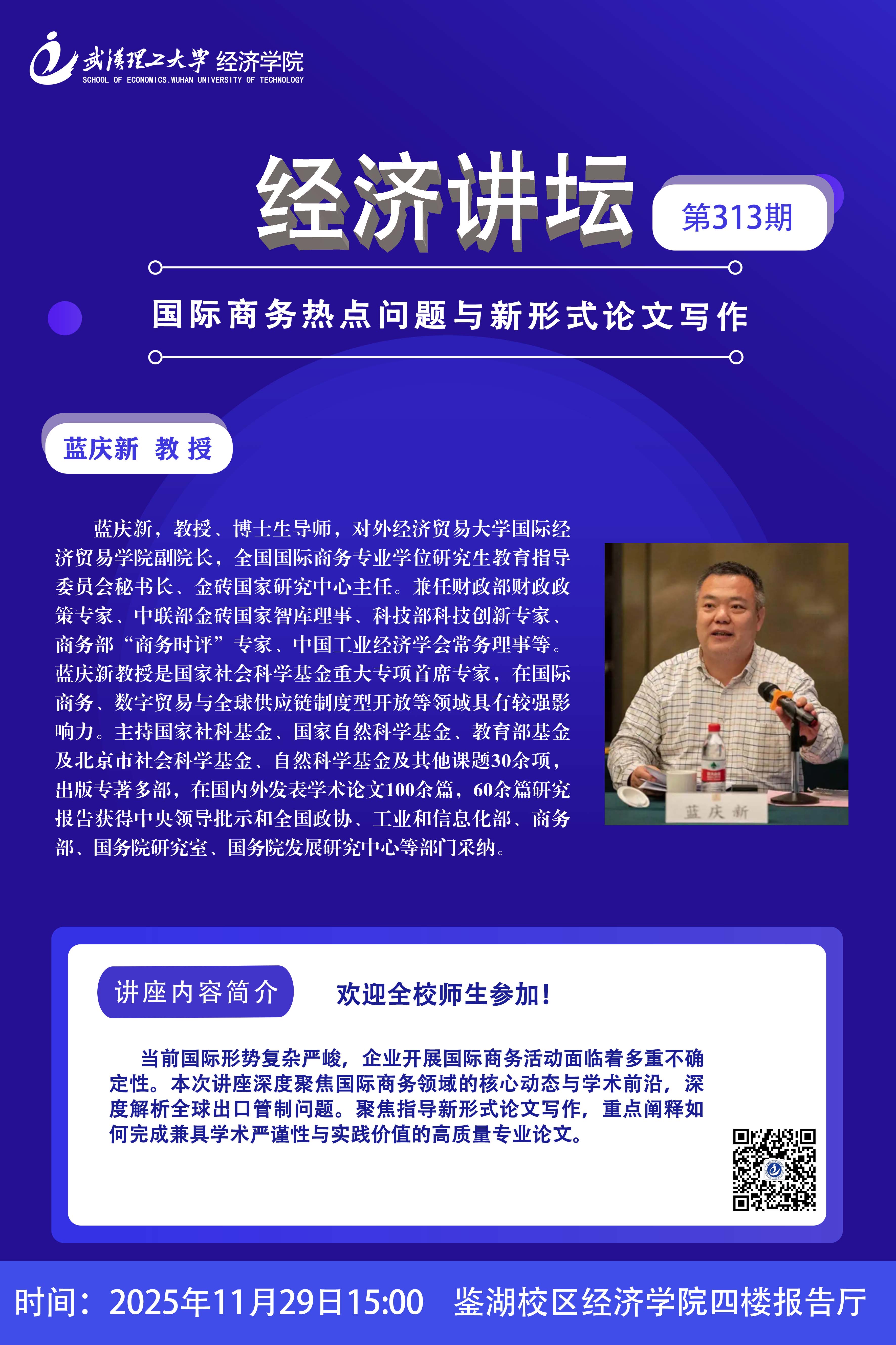 【经济讲坛】第313期 蓝庆新教授:国际商务热点问题与新形式论文写作