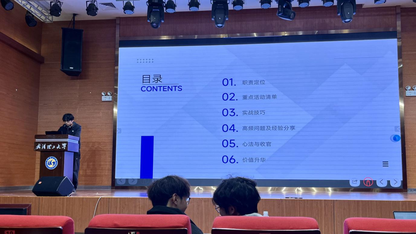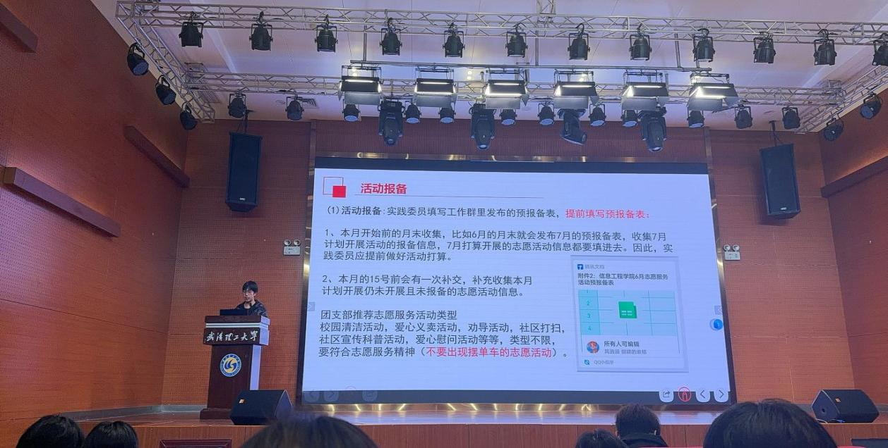 信息公司班级实践委员金明拓明确了实践委员作为班级与社会连接者的定位,强调组织策划能力的重要性,详解活动报备流程与社会实践活动类型,为新生班干开展实践活动提供了清晰思路。