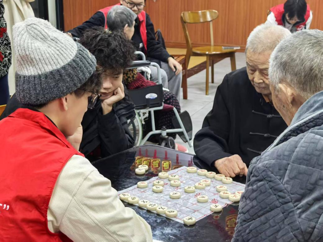 活动室内,棋牌对弈活动有序开展,象棋、围棋、扑克牌等棋牌项目依次摆开,支部团员与老人结对展开 “忘年对弈”。对弈过程中,团员们虚心向老人请教棋艺牌技,老人则耐心指点,方寸棋盘与牌桌之上,不仅有思维的交锋,更有跨代的温情交流,欢声笑语萦绕现场。