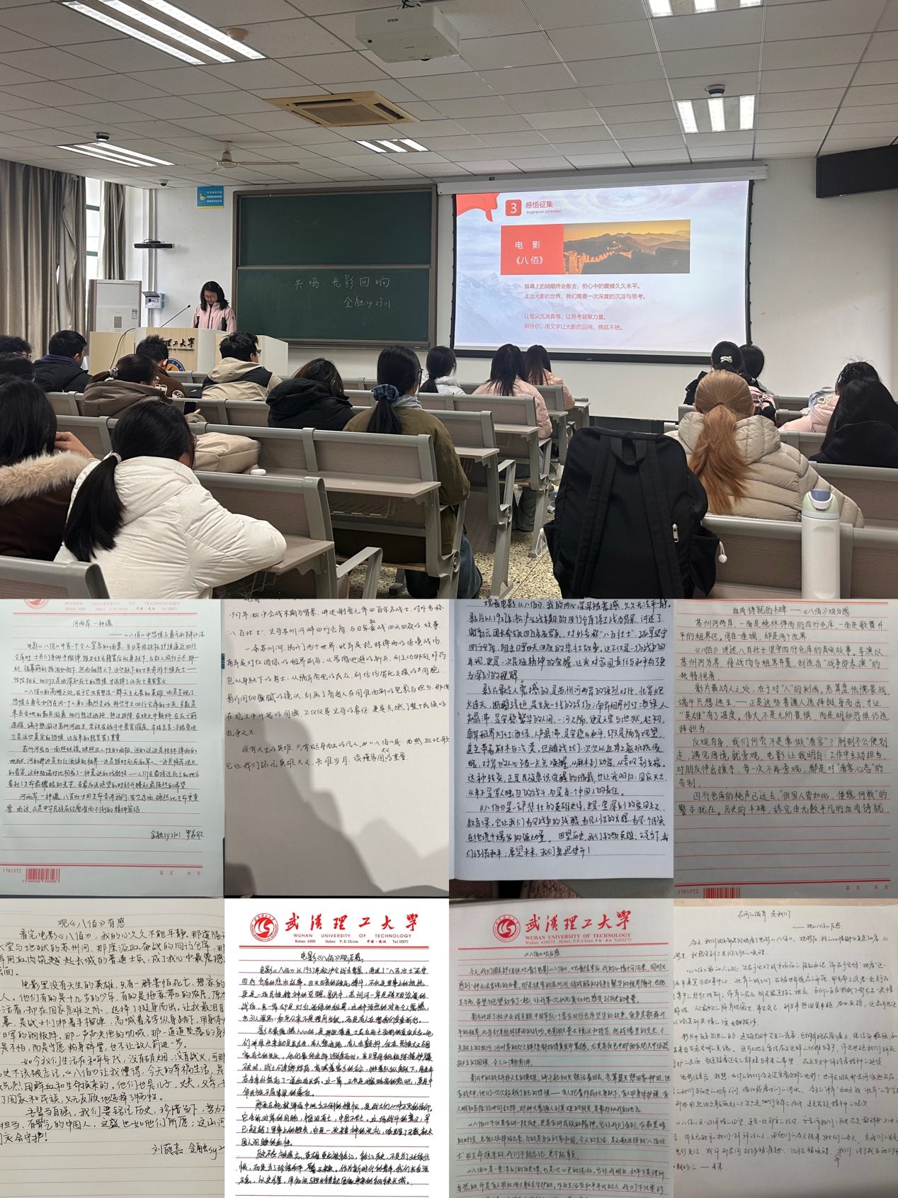 影片《八佰》以1937年淞沪会战末期的四行仓库保卫战为背景,讲述了“八百壮士”在孤立无援的绝境中,以血肉之躯坚守阵地、抵御外敌的悲壮故事。当银幕亮起,同学们全神贯注,神情肃穆。那些战火纷飞的年代、那些为信仰而战的身影,就这样鲜活地出现在我们眼前。战士们身绑炸药纵身跃下、在枪林弹雨中护旗不倒的震撼场景时,不少同学眼含热泪,紧握双拳,被革命先烈视死如归的英雄气概深深震撼。大家或专注凝视,或认真记录,仿佛与先辈们进行了一场跨越时空的对话。