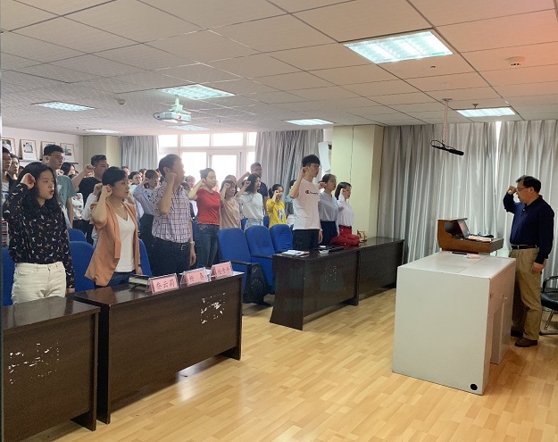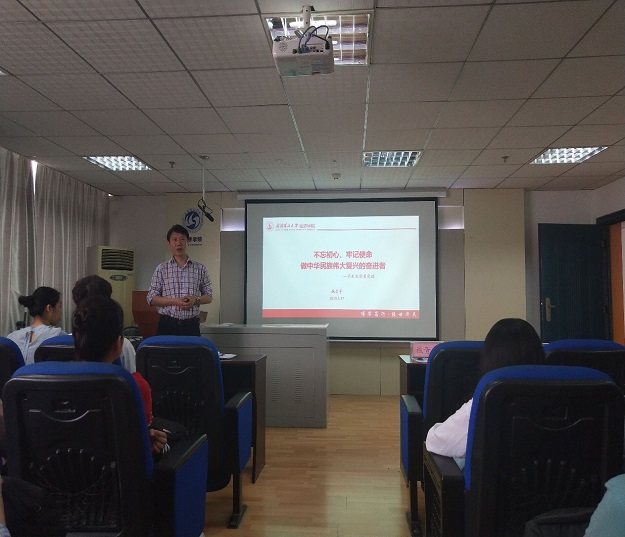 活动伊始,由党委书记施青平同志为2019届毕业生党员上最后一次党课。他从新时代中国共产党的历史使命及习主席在五四青年节上的系列讲话精神入手,逐渐过渡到身边自强不息、将自我价值与国家价值相联系的党员实例上,并对毕业生党员提出要求和期许:“毕业生党员要不忘初心、牢记使命,做中华民族伟大复兴的奋进者。”