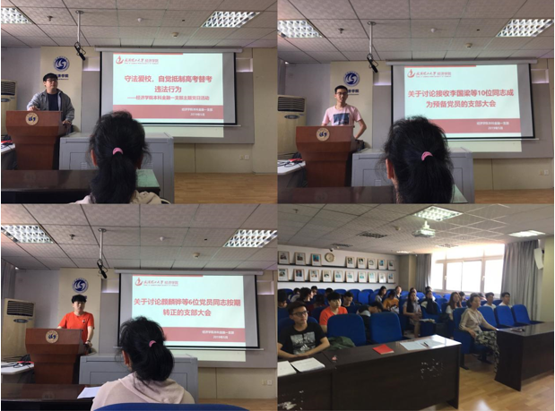 会议第二项讨论了关于接收李国梁等10位同志成为预备党员的决议。李国梁等十名党的发展对象依次上台,对自己的各方面表现与入党动机进行阐述,随后党支部内的正式党员依次举手表决。最终,李国梁等十名同志均多数通过。叶双龙老师向他们提出期望:希望他们可以真正做到全心全意为人民服务,不断提升政治理论学习与专业知识学习,并把所学投入到实践中去。