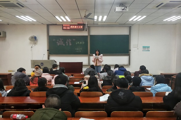 严肃班级考风考纪,提高同学们诚信意识。12月13日,金融1703班在南湖新一309教室开展了以“明纪扬帆,诚信应考”为主题的班会,会议由班长肖扬主持,班主任张晓文老师及全体同学参与。