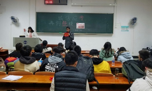 为加强同学们树立诚信应考的理念,并能够了解到更多的复习方法,12月17日晚21:00,国贸1701全体成员在新二101教室召开了以“诚信应考,再创佳绩”为主题的班会,此次班会由班长陈安康主持。